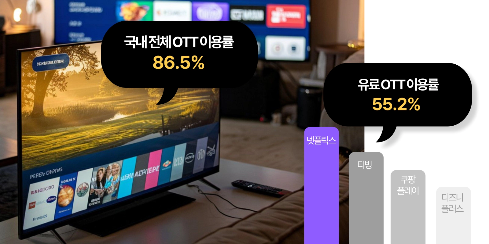 국내 전체 OTT이용률은 86.5%, 유료 서비스 이용률도 55.2% 나 된다고해요!
