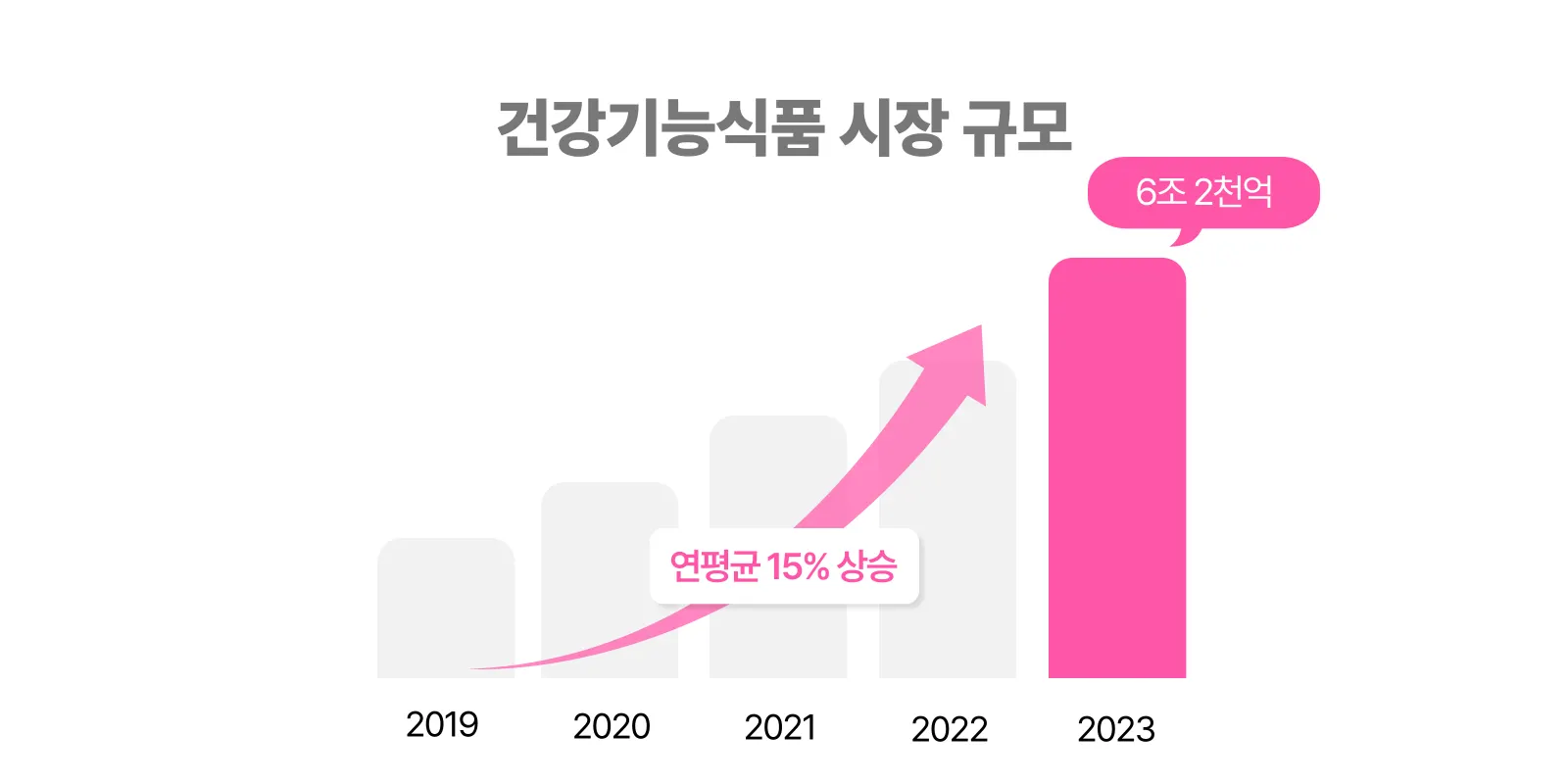 한국건강기능식품협회에 따르면, 2022년 국내 건강기능식품 시장 규모는 6조 원을 넘어섰고,
