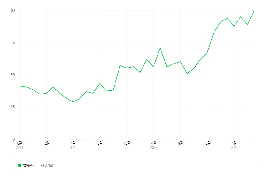 실제로 ‘혈당관리’ 키워드가 최근 1년 사이 꾸준히 우상향 하는것을 확인 할 수 있었어요.