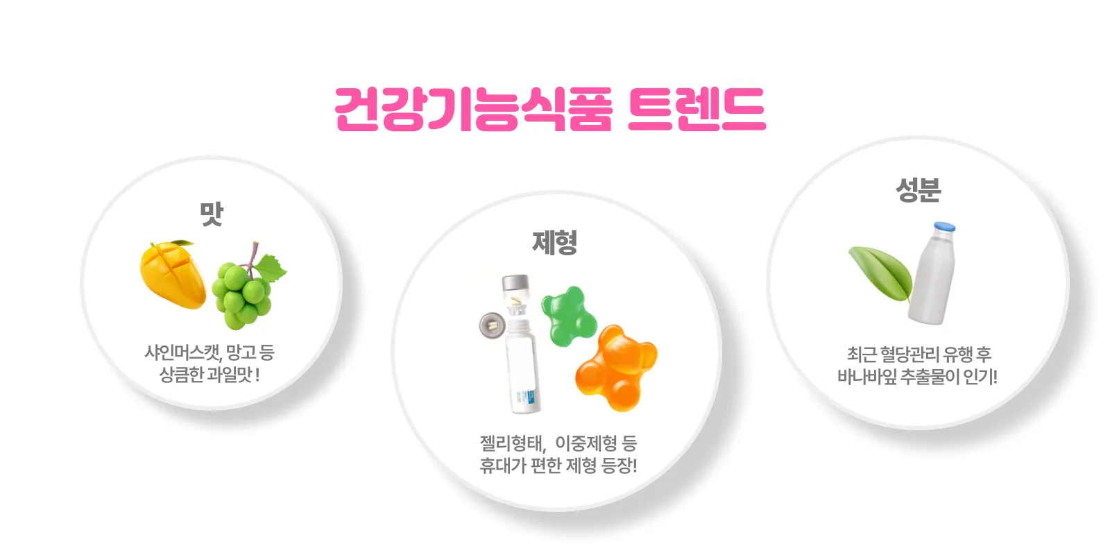 타겟이 달라지기도 하기 때문에 건강기능식품 시장의 트렌드는 정말 변화무쌍하답니다!