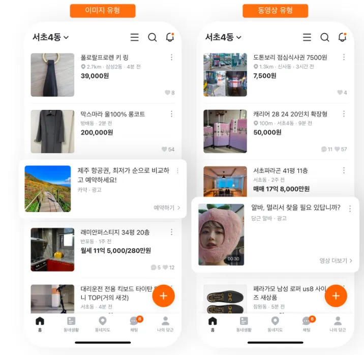 당근 앱 내 트래픽이 가장 높은 홈탭의 피드 게시글 사이에 노출되는 광고로