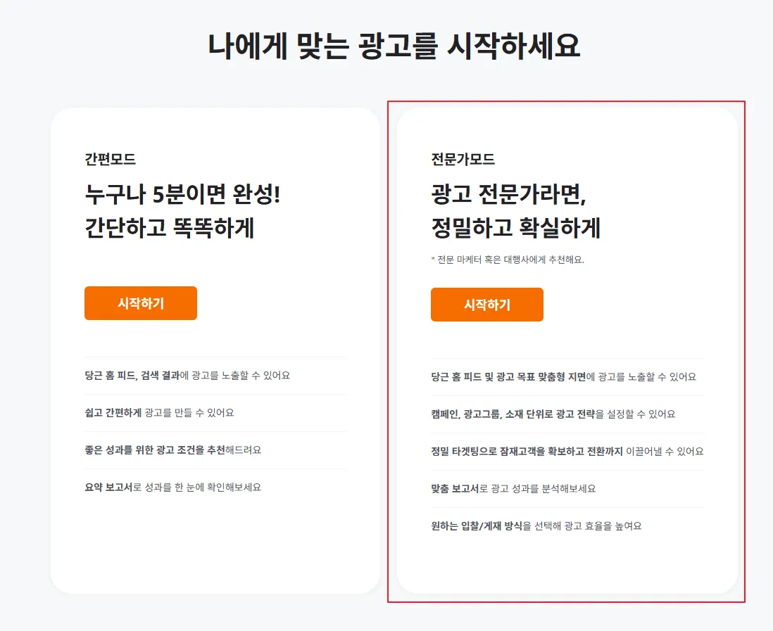 전문가모드는 목표별 캠페인 관리, 정밀한 타겟팅 등 효과적인 광고 운영을 지원하기 때문에