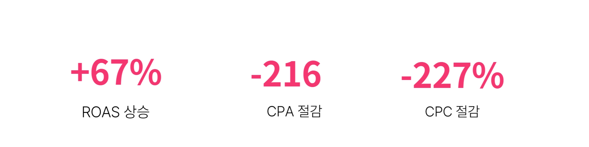 패션 브랜드의 특성상, 영상 소재 외에도 다양한 이미지 소재를 활용하여 틱톡과 팽글 지면별로 나누어 캠페인을 세팅하여 운영하며 성과가 높은 지면에 예산을 집중하고 일 예산을 증액하는 전략적인 운영을 하였습니다. 제너럴 아이디어는 틱톡 구매 전환 캠페인만 진행했을 때보다 틱톡과 팽글 구매 전환 캠페인을 동시 진행하여 더 좋은 구매 전환 및 CPC 성과를 얻을 수 있었습니다. 그 결과 ROAS는 67% 상승, CPA와 CPC는 200% 이상 절감하며 우수한 성과를 기록했습니다.