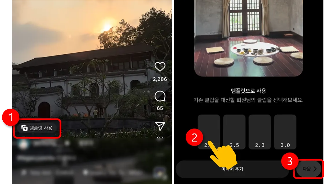 인기 많은 릴스 하단에 보시면 템플릿 기능을 활용할 수 있어요.